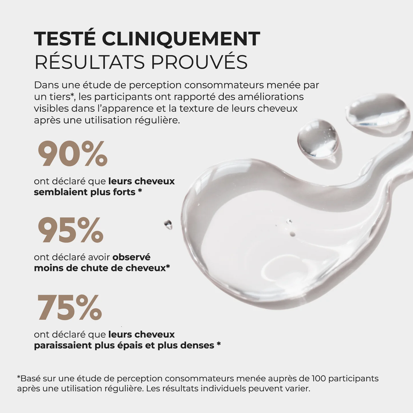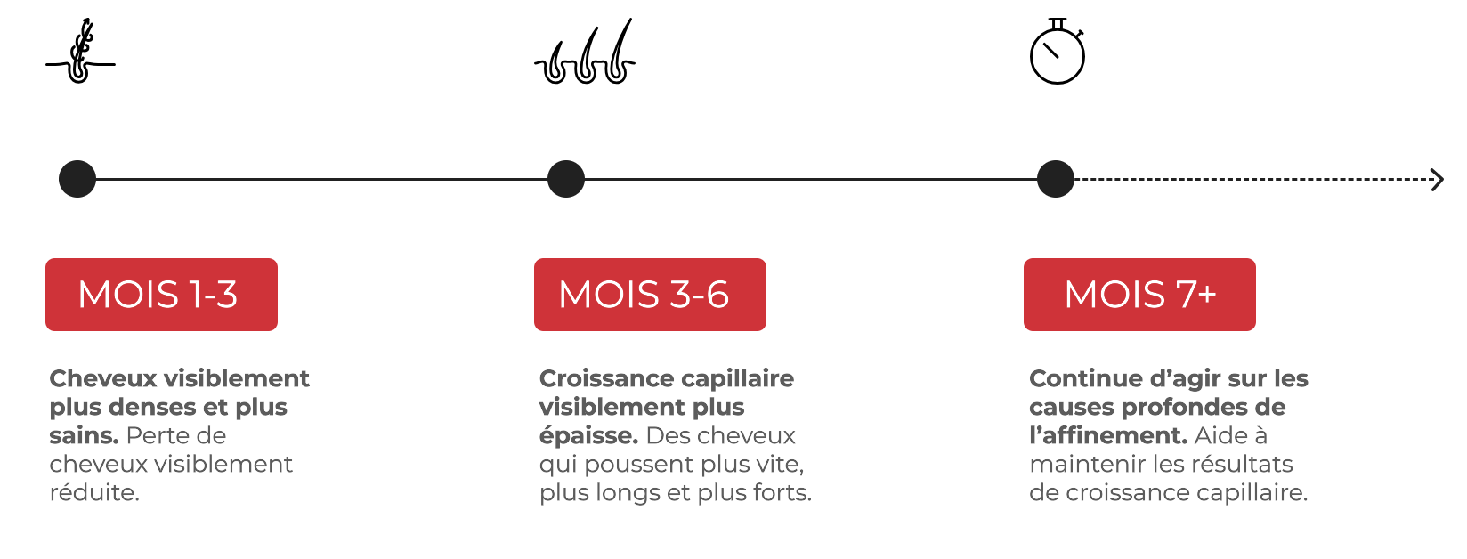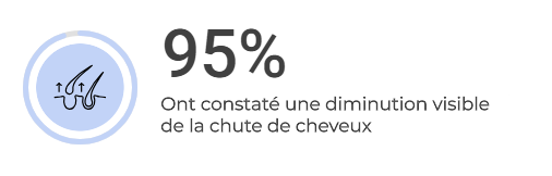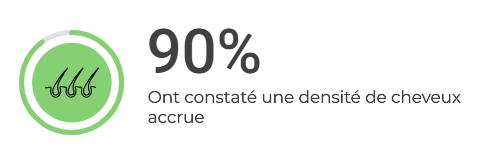 Les clients constatent généralement des résultats dans les 90 premiers jours : une meilleure santé globale des cheveux, une diminution de la chute et/ou l’apparition de nouveaux cheveux.