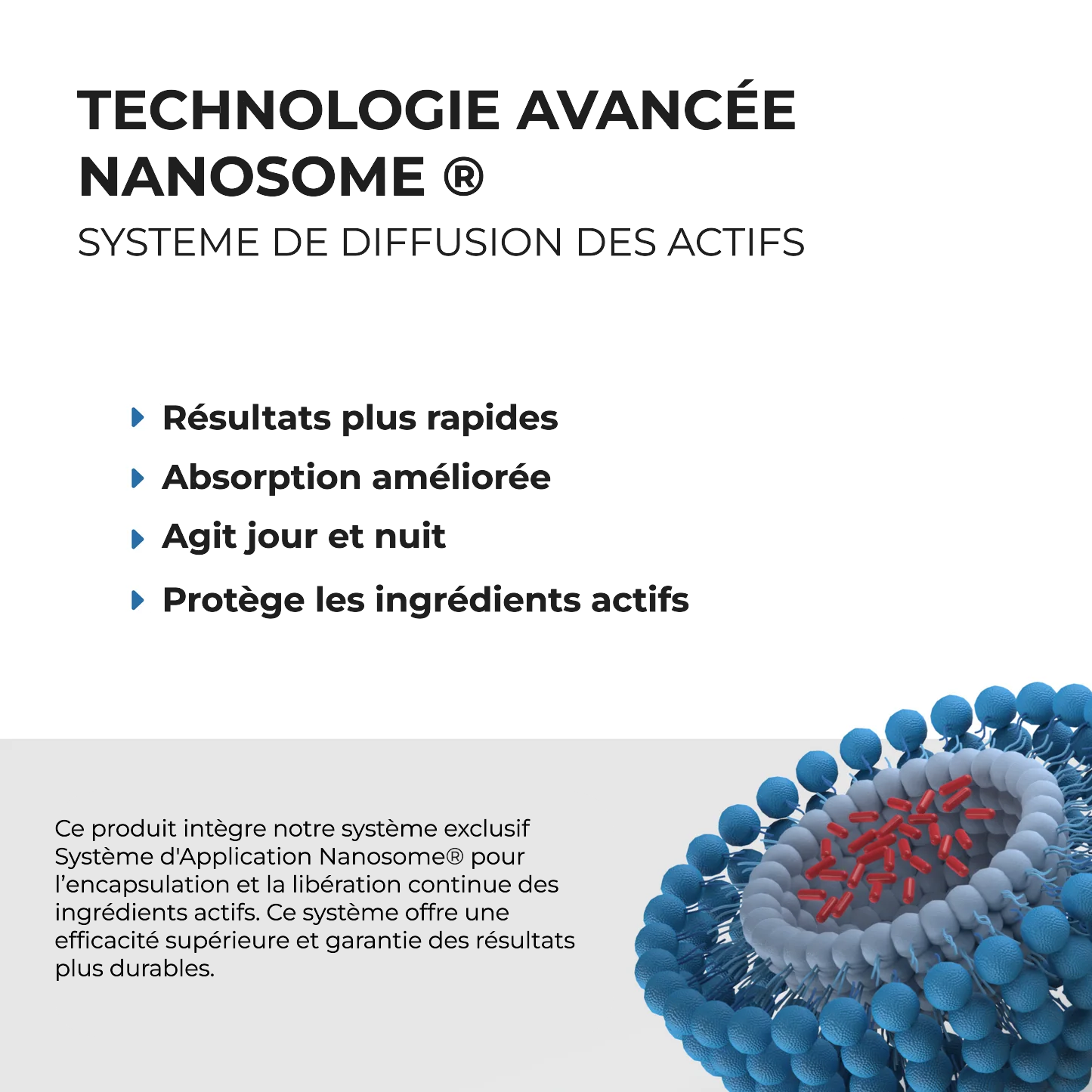 - Diffusion avancée des ingrédients actifs via Nanosome, notre technologie exclusive de diffusion Nanosome encapsule les actifs dans des liposomes microscopiques pour des résultats optimaux.